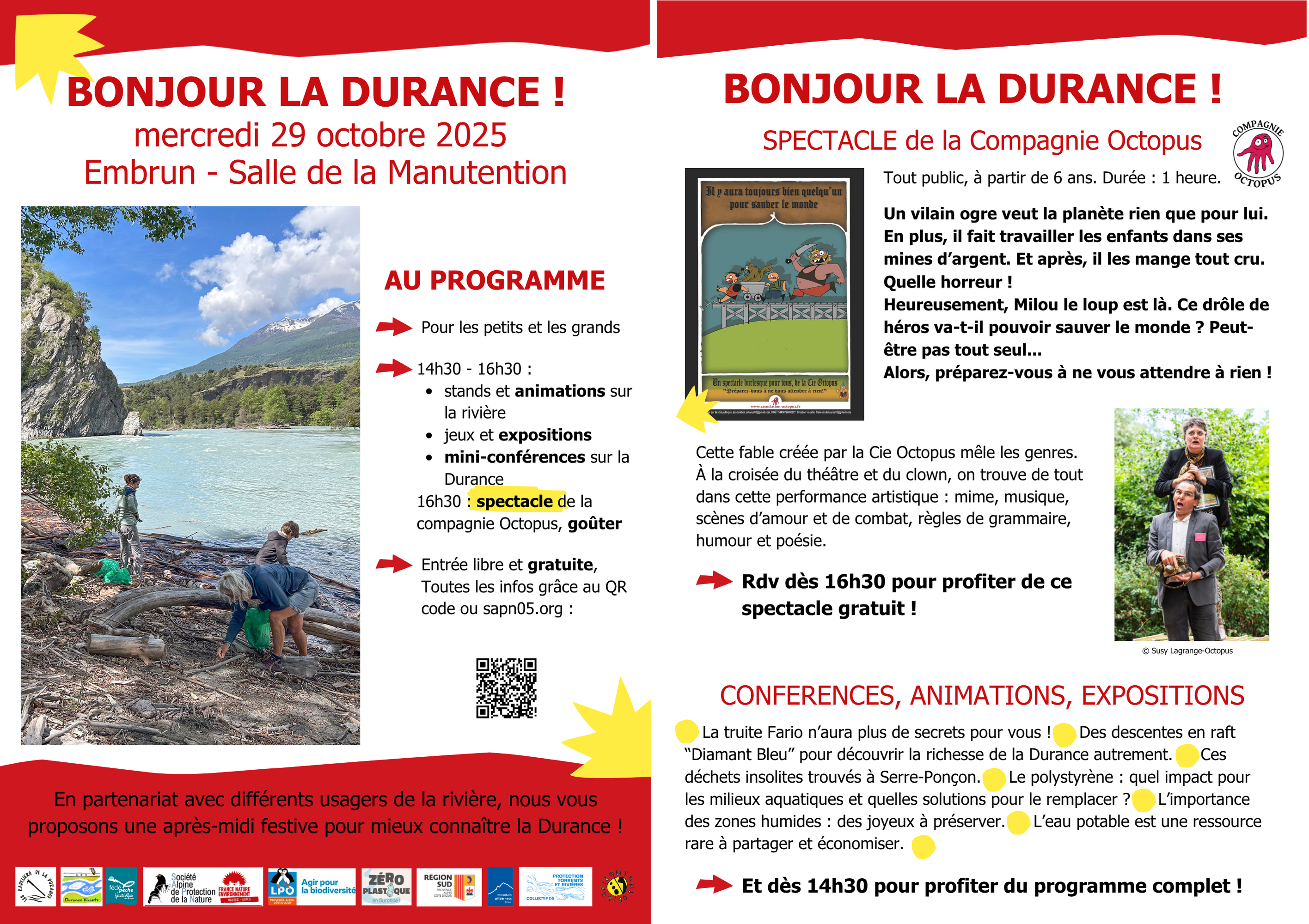 De nombreuses associations seront présentes pour vous présenter leur travail pour la Durance via des animations et des conférences. Le spectacle «Il y aura toujours bien quelqu’un pour sauver le monde» de la compagnie Octopus, accompagné d’un goûter offert sera la dernière partie de cette journée.