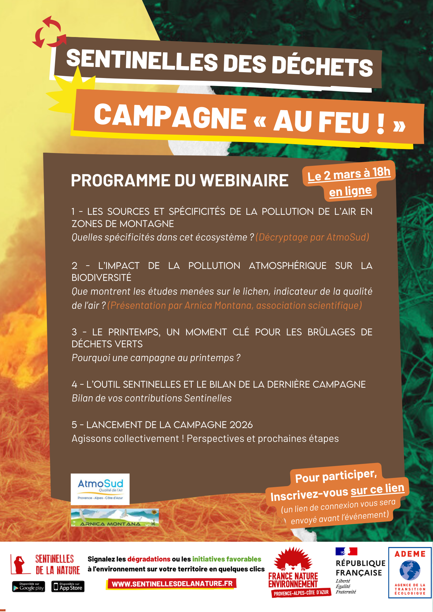 Nous vous invitons à notre webinaire de lancement le lundi 2 mars 2026 à 18h, en présence d’AtmoSud et Arnica Montana (association membre de la SAPN-FNE 05) ! Pour cette campagne, nous aborderons l’impact des brûlages en montagne, un milieu spécifique loin d’être exempté des pollutions.
