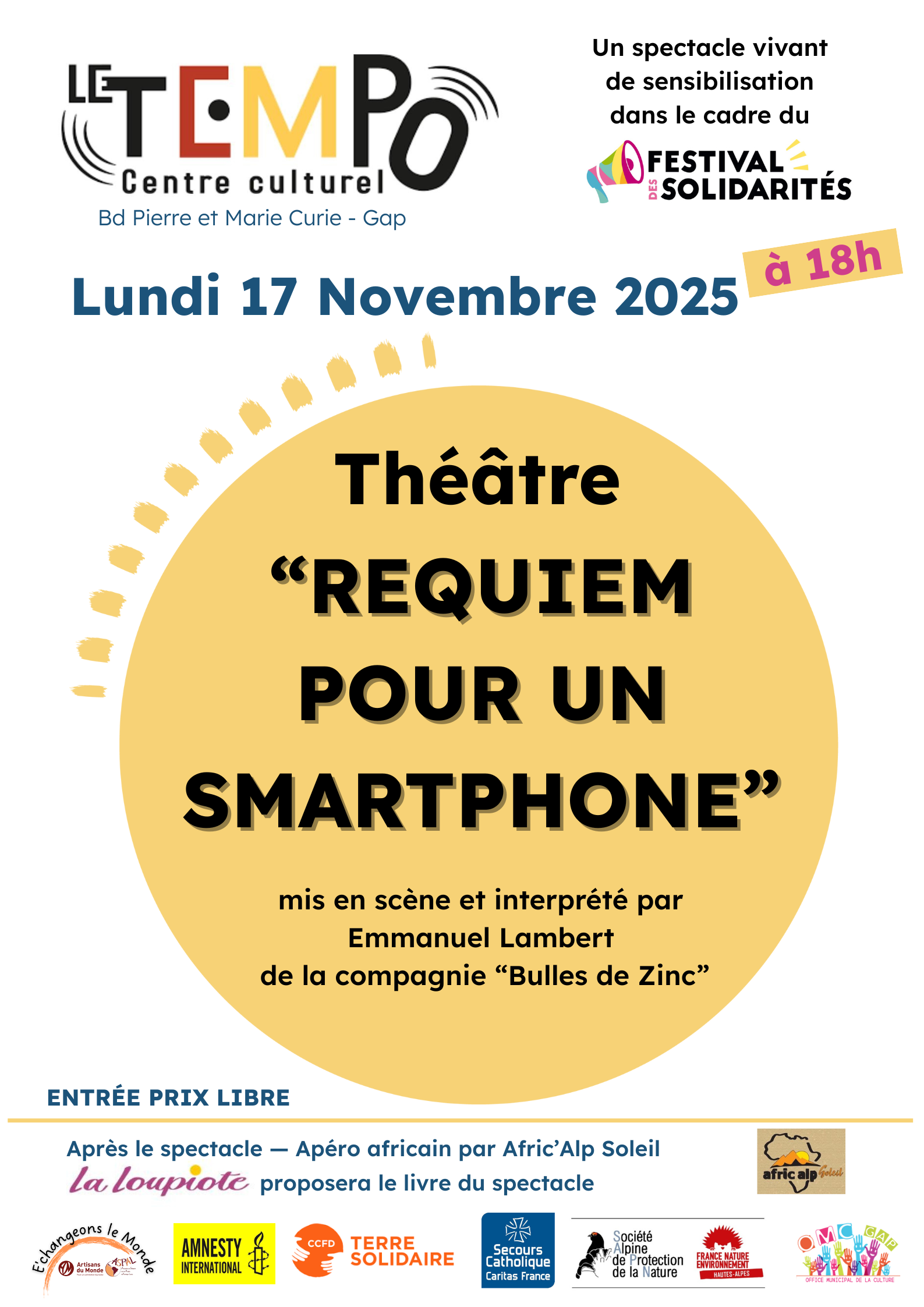Dans le cadre du Festival des Solidarités, Echangeons le monde, en partenariat avec la SAPN-FNE 05 vous propose à Gap au Tempo le 17 novembre, la pièce de théâtre «Requiem pour un smartphone» par la troupe Bulles de zinc qui invite à réfléchir sur la numérisation de nos sociétés.