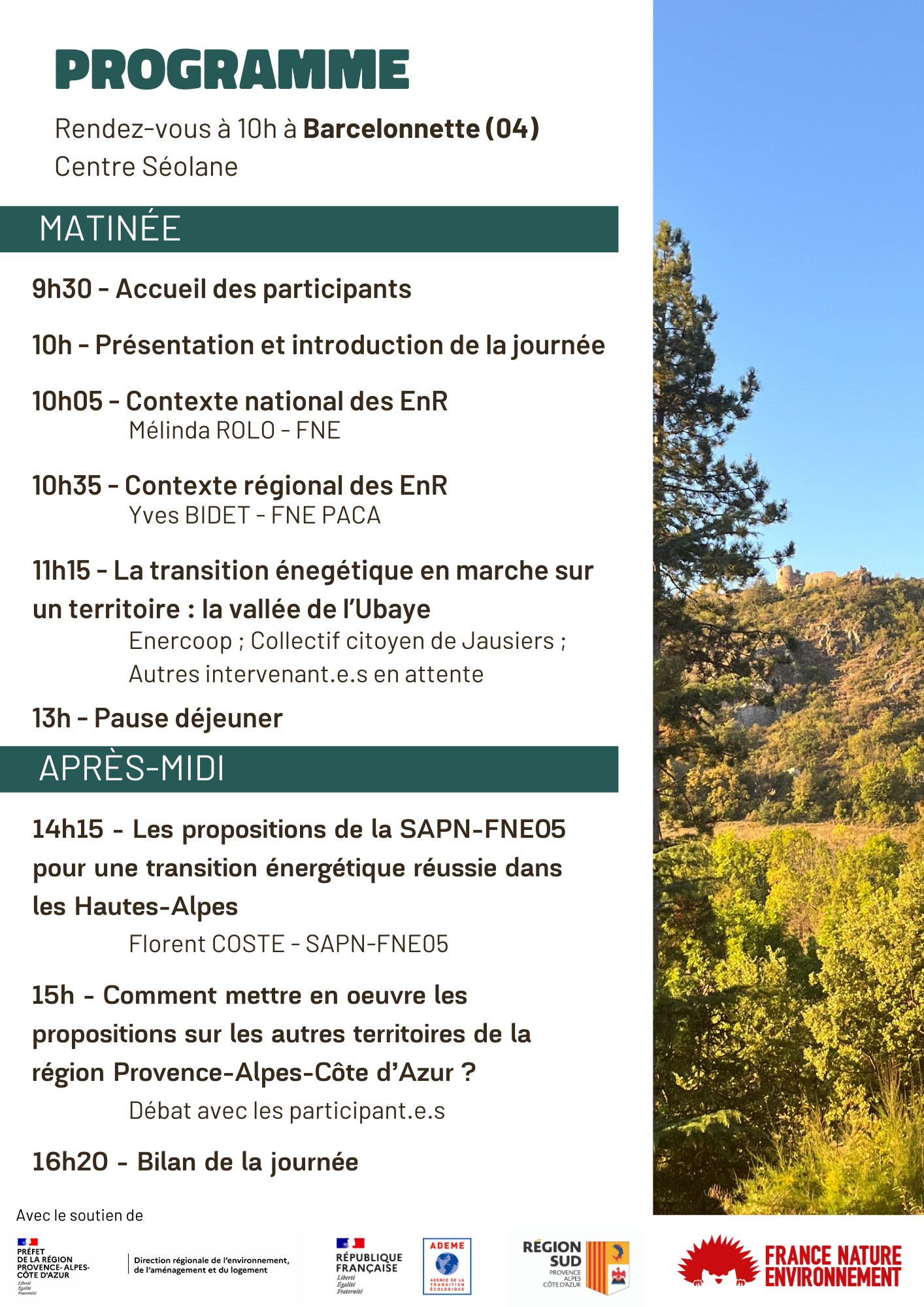 Le 15 octobre, à Barcelonnette : venez découvrir les propositions possibles pour progresser vers du 100 % renouvelable dans les Alpes du Sud. La SAPN-FNE 05 présentera le travail de son groupe de travail énergie qui a imaginé un scénario 100 % énergies renouvelables dans les Hautes-Alpes.