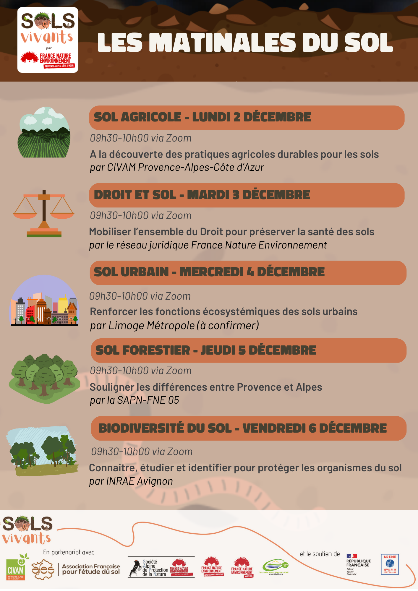 Construites sur un format court de 30 minutes, ces matinales présenteront rapidement les plaidoyers du projet Sols Vivants, avec l’intervention d’un·e expert·e pour répondre à l’ensemble de vos questions. Ouvert à tous et toutes, elles vous permettront de découvrir rapidement les clés et enjeux pour donner toute sa place au sol comme bien commun.